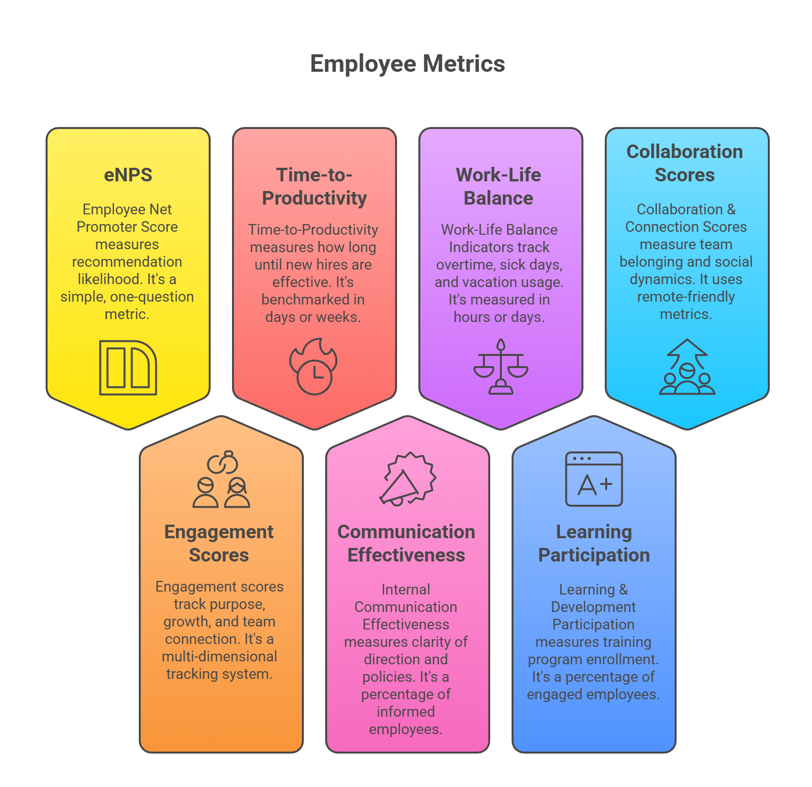 Let’s get practical. Measuring employee experience means looking at multiple dimensions of your workplace. Here are the critical metrics to track: