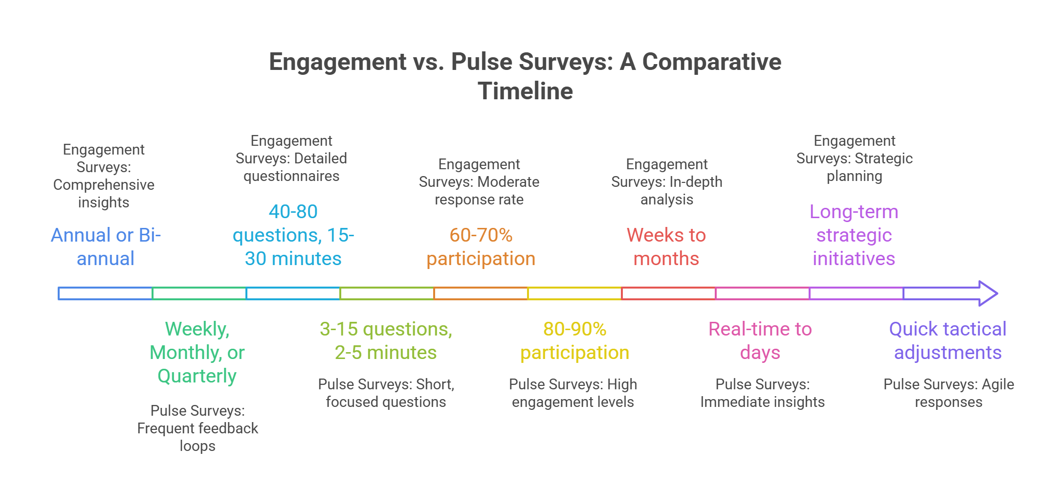 Length and Depth Engagement surveys are comprehensive with 40-80 questions exploring topics deeply. Pulse surveys are brief with 3-15 questions focusing on specific issues. If engagement surveys are novels, pulse surveys are text messages.